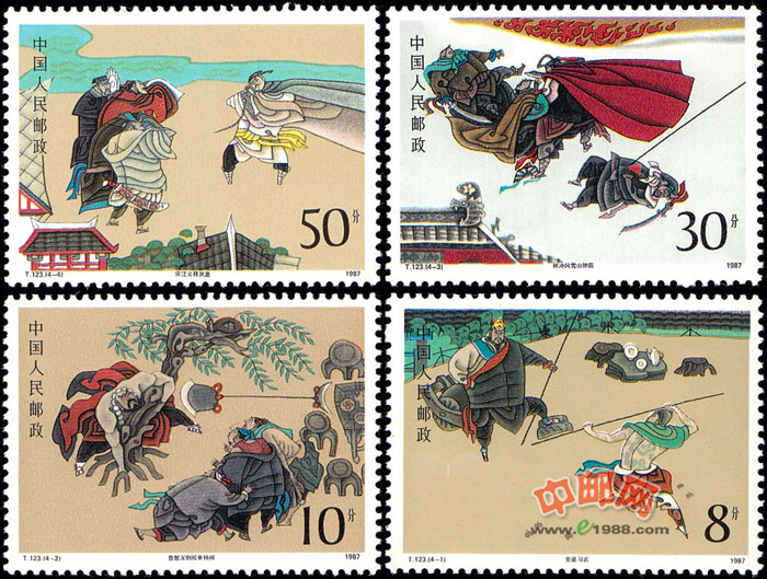 本邮票设计者以中国传统的工笔重彩画法为主,吸收其它画种的优点,并借鉴宋代绘画和造型之长,大胆运用了夸张变形的手法,使整套邮票体现出一种写意性、时代感和生活趣味的巧妙融合,出色地展示了水浒人物的精神风貌。在整体关系上,作者刻意通过对比和呼应,加强邮票的节奏感和连续性。在运笔和设色上,作者也别具匠心。从图形的勾勒到线条的处理,在稚拙中透出生气,在灵活变化中显出力度。其中人物的衣带折纹纵横相间,刚柔相济,疏密相应,既表现了动态,又有很强的质感,而且装饰意趣浓厚。整个画面以黄、棕、灰为基调,间以红、蓝、绿,于浑然古朴中见鲜明。