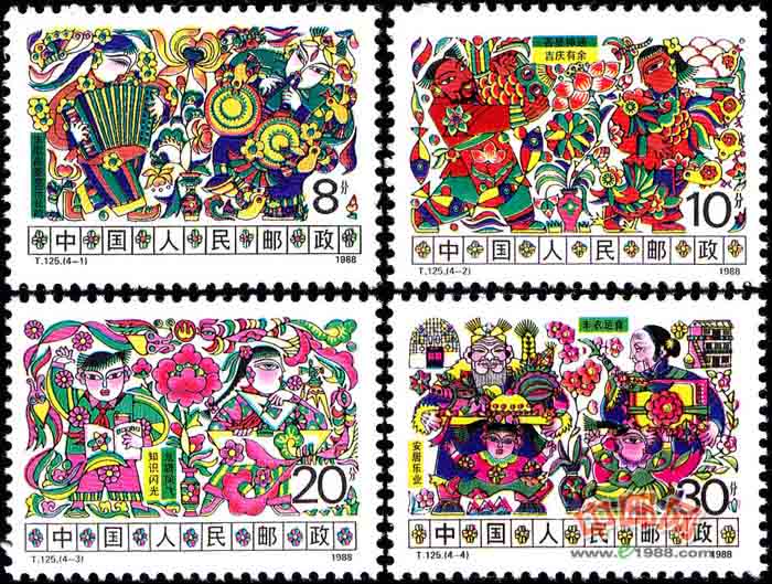 这4枚邮票中的喜鹊登梅、大鸡有余、花飞蝶舞、腾龙飞凤环绕着老年、中年、青年、少年的主体人物形象,又分别以花瓶中的牡丹、莲花、菊花、梅花,暗喻 “四季平安”,十分符合广大农民的审美意识。