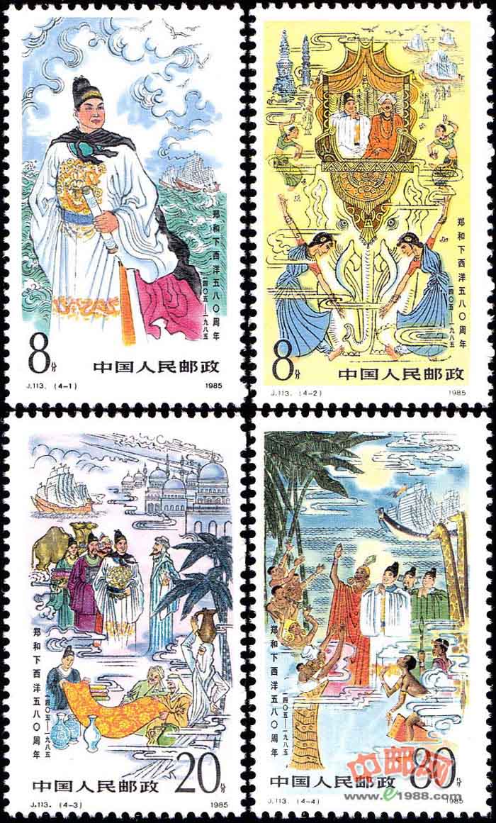 郑和(1371——1435),本名马和,回族,云南晋宁人。因随燕王朱棣起兵有功,赐姓郑。任内宫监太监。郑和是我国明代伟大航海家。在1405年至1433年的28年间,他先后七次率领明朝船队远航,到达30多个国家,最远到达非洲东海岸。他是和平的使者,开辟了中国与亚、非各国的政治联系。郑和每到一地,都用中国产的磁器、丝绸、金银等物品换取当地特产,促进了中国与亚非各国的经济和文化交流。郑和的远航比哥伦布、达·伽马的航行要早半个多世纪。当时郑和所乘船只最大的长约150米,宽约60米,可容1000人,船队规模很大。1985年是郑和下西洋580周年,为纪念这一世界航海史上的壮举,邮电部特发行这套纪念邮票。 本套邮票共4枚。