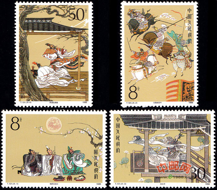 这套邮票画面简洁,繁而不乱。在绘画手法上,以中国工笔画法为基础,又有所创新。重线条,重传神,同时揉进了夸张、写意的技法,使人物形象形神兼备,音容笑貌跃然纸上。画面均以赭黄为底色,并巧妙地运用白色、绿色突出人物形象,使画面秀丽、洒脱,既具古典韵致,又富浪漫情趣。
