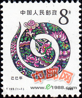 本套邮票共1枚。画面设计独辟蹊径,整条蛇在画面上形成一个圆形图案,不但展示了蛇的整体形态和基本习性,而且充分地体现出蛇的机警和俏皮之态。蛇身绘满牡丹、荷花、菊花和梅花,头部口中吐出吉祥的灵芝草,尾是摇甩鱼一样的尾巴,整条蛇身隐含一年四季吉祥如意,年年有余(鱼)。