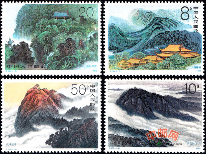 4-4为“祝融雄峰”。祝融峰海拨1290米,是衡山诸峰中最高的一座,峰顶有祝融殿,供奉祝融火神。殿右有巨石,上刻“唯我独高”;殿西侧有望月台,峰顶下南面山上有观日台,祝融雄峰之高为南岳绝妙景观之一。画面上祝融峰突现云海之上,峰顶在落日余晖下被染成红色,更显出其雄伟之势。