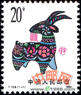 此套邮票1枚。图案上画的是一只“回头羊”。羊遒劲的弯角、微叉的前腿、短小的翘尾,给人以生机勃勃之感。造型参考中国民间布玩具的造型,简明洗练的弧线表示,给人稚拙、纯朴、雅致之感。底色为纯白,羊身则由黑色、湖蓝、玫瑰红等饱和度较高的暖色绘出牡丹、荷花、菊花、梅花,装饰效果艳丽而不妖娆。