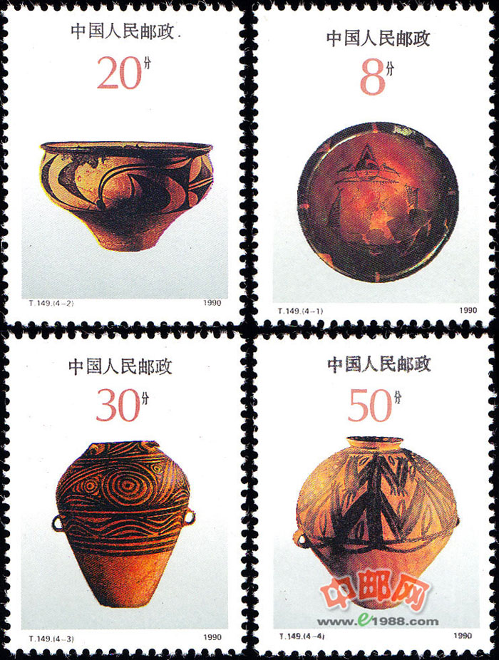 本套邮票共4枚,选取了黄河中、上游地区各时期的具有代表性的四件彩陶作品。底色以白为主,下部略显曙青色,犹如清新的晨空,鲜明地衬出置于画面上的棕红色的彩陶,以简洁的手法表现被誉为远古文明之花的中国彩陶。