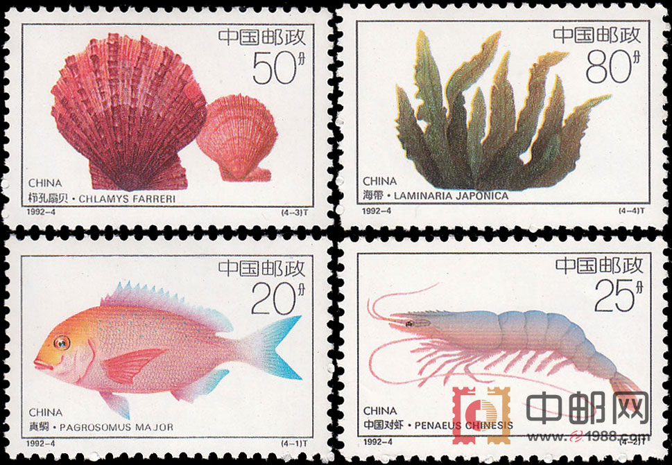4-2为“中国对虾”。对虾是节肢类动物,邮票画面强调一种纤巧的感觉。