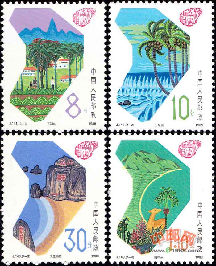 本套邮票的设计者将海南省图形做成一方刻有邮票名称“海南建省”字样的随形印章,附于每枚邮票的右上角,与这套邮票的主体图案构成一个有机的整体,巧妙地运用了中国传统的篆刻艺术,故给人耳目一新的感觉。