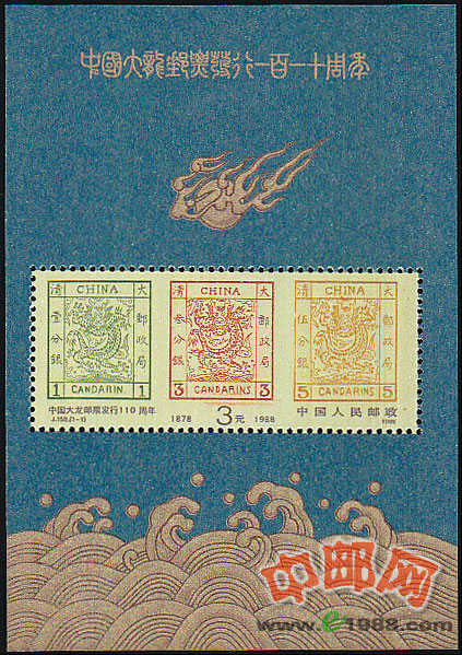 本套邮票便是为纪念大龙邮票发行110周年而设计的。小型张的画面以蓝色为底色,画面正中并列着3枚清代发行的大龙邮票。龙票之上,一团熊熊火苗簇拥着一颗金色宝珠。龙票之下,是明清时期常用的“海水江牙”装饰图案。作者采用了中国古代装饰绘画中的技法,追求古典、庄重、和谐、富有时代感的艺术风格,这些风格及色彩的运用,都极好地表现了主题。在色彩上,作者采用了蓝色。蓝色为天空的颜色,而天是中国古人所崇拜的对象,皇帝被认为是真命天子。传说蓝色在清代代表苍穹,如清朝帝王前去祭天和祈祷丰年的名胜古迹天坛,其中的祈年殿、皇穹宇都是用蓝色琉璃装饰其顶的。