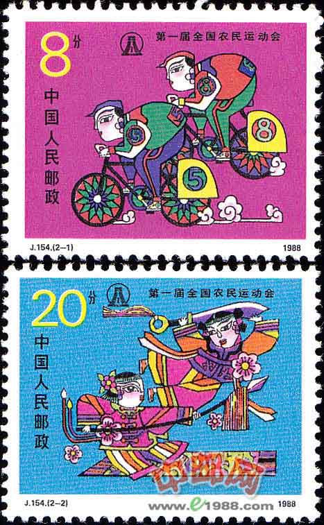 中国第一届全国农民运动会1988年10月9日至16日在北京先农坛体育场和北京市区、郊区八个场地举行。 这届运动会由农业部、国家体委和中国农民体育协会联合举办。 首届农运会共设八个项目。其中竞赛项目为田径、篮球、乒乓球、自行车、射击、足球和中国式摔跤; 表演项目为武术和蒙古式摔跤,共有3000多名运动员进京参加比赛。这届运动会取得了圆满成功。为纪念中国农民体育运动史上崭新的一页,邮电部特发行了这套邮票。