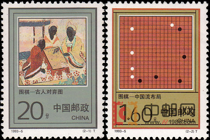 设计者运用黄金分割法,在30mm×40mm的票幅中,隔离出20mm×20mm的小画幅,设计出两枚具有强烈对应美的邮票。前者“动”,后者“静”,形成了和谐的对应美,两者动静结合使人们对围棋活动有较全面理解。