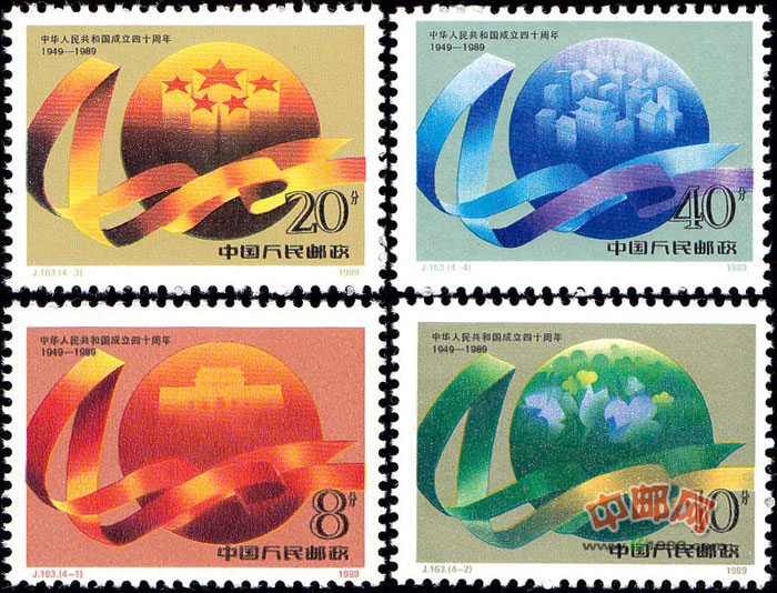 本套邮票共四枚,构图别开生面,十分新颖。主体画面是彩带缭绕的圆球图案,它们共同组成“40”字样。