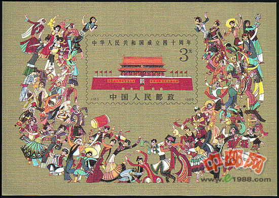 1989年10月1日发行的J163“中华人民共和国成立四十周年”纪念邮票,全套4枚,小型张1枚。邮票主体画面为彩带围绕圆球,组成“40”字样,表现我国如旭日东升,百业兴旺,繁荣昌盛。
