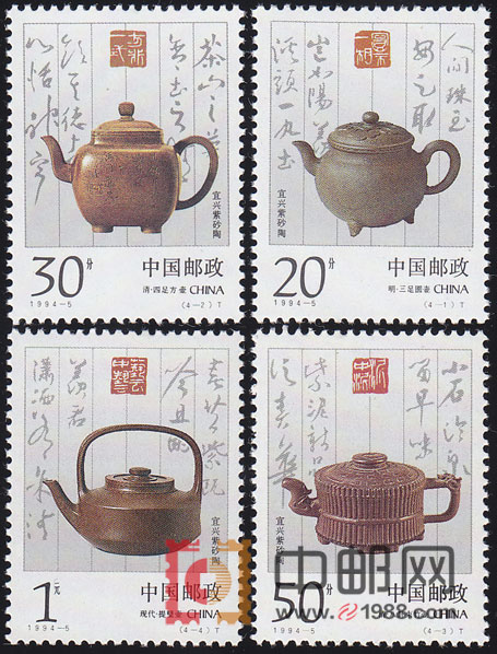 宜兴紫砂陶是陶都的一颗明珠,它始于北宋,盛于明清。宋元至明正德年间为紫砂陶的初创时期,明嘉靖至万历年间,紫砂陶开始走向成熟和繁荣。历代紫砂艺人,利用宜兴得天独厚的紫砂陶土,用灵巧的双手和聪明才智,创作出了富有民族文化特色和艺术生命的紫砂陶艺珍品。这套邮票画面上的4把紫砂壶,是历代紫砂名家的代表之作,反映了紫砂陶艺的主要风格和造型,使人领略和欣赏到宜兴紫砂陶的艺术神韵。