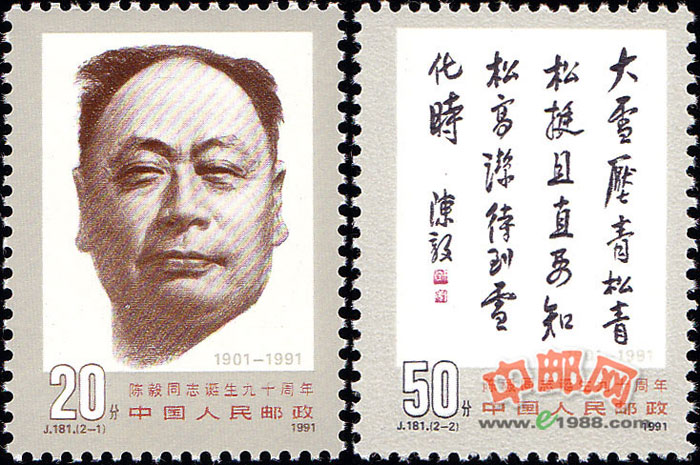 这套纪念邮票共2枚。第1枚是陈毅的标准像。另1枚选用了陈毅手书的一首诗稿,诗如其人,这首诗作为陈毅为人的写照而广为人知。