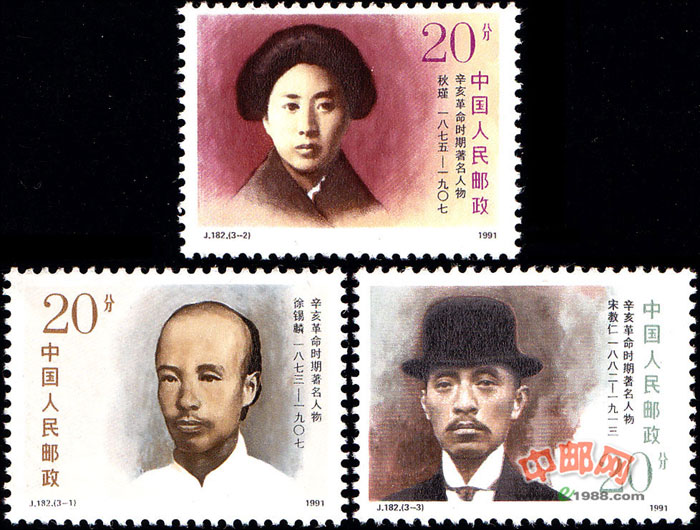这套纪念邮票是纪念辛亥革命80周年于1991年10月10日发行的,画面依次是为辛亥革命献出生命的著名人物徐锡麟、秋瑾、宋教仁。
