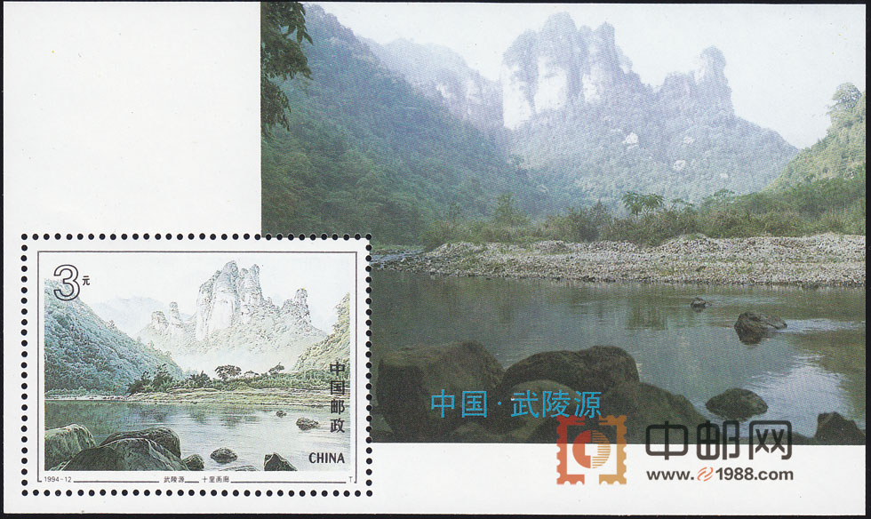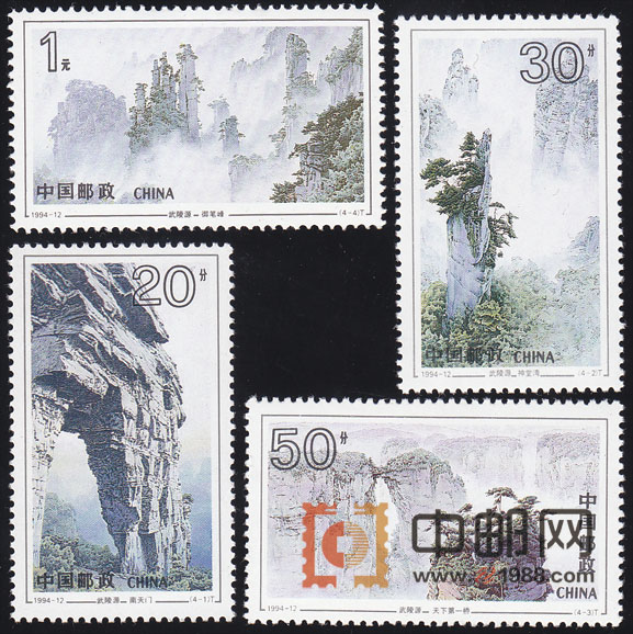 武陵源位于湖南省张家界境内,由于地质变化和水流切割作用,洪荒时期这里就形成了罕见的砂岩峰林峡谷地貌,石峰、石桥、石门、石洞纵横交错,鬼斧神工;山、水、禽、兽随处可见,同生共荣,构成一幅奇特的大自然山水画卷。1992年12月,武陵源被联合国教科文组织列入《世界自然遗产名录》。设计者抓住了武陵源不同凡响的自然景观,选取最有光彩、最具特色的5个景点,构成了这套令人瞩目的邮票画面。