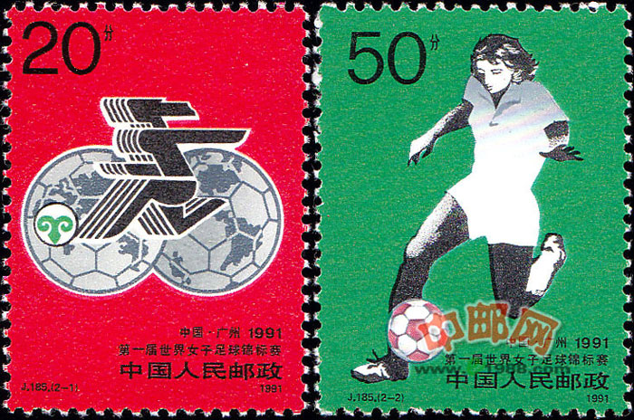 2-1为“会徽”。图案采用了广州美术公司何世德先生设计的本届锦标赛会徽。会徽将世界的东西两半球设计成足球形式,中间是一位运动感很强的抽象化了的女足运动员踢足球的身影。足球上有一羊形符志,意思是正逢羊年,又在羊城举办。会徽呈灰色调,选择红色作为邮票的底色,使会徽更加醒目、突出。