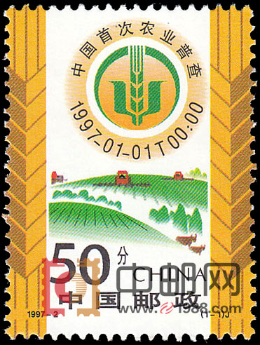 为适应改革开放的新形势,国务院决定,1997年进行第一次全国农业普查,并从这一年起,今后每10年进行一次,全面调查农业和农村的基本情况。1997年1月1日正式查点,普查的时点指标的标准时间是1996年12月31日,时期指标的标准时间是1996年1月1日至1996年12月31日。邮电部为这次农业普查发行的邮票主图为富饶原野烘托下的1枚徽记,由麦穗和鸽子的剪影组成,表达了普查为和平建设服务的主题。
