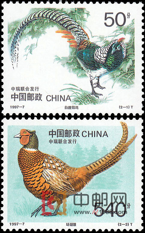 【图案面值】T (2--1)白腹锦鸡 50分 3275.7万枚T (2--2)环颈雉 540分 2612.7 万枚邮票介绍: 一个位于北欧斯堪的纳维亚半岛东部,介于芬兰和挪威之间的王国。1950年5月9日,新生的中华人民共和国与瑞典王国建立了大使级外交关系。47年后,中瑞两国决定在建立纪念日来临之时,联合发行1套《珍禽》特种邮票,通过飞入方寸之中的友好使者,即邮票画面上的白腹锦鸡和环颈雉,来表现中瑞两国人民之间的传统友谊。