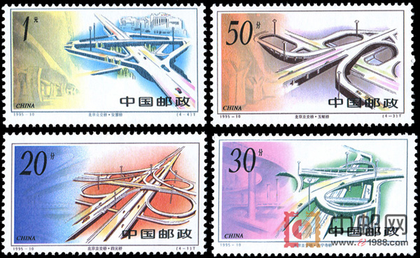城市立交桥是现代化都市繁荣发达的重要标志。1974年北京首座立交桥——复兴门桥建成,开了首都城市交通立体化的先河。为了促进经济的飞速发展,适应交通负荷的增长速度,北京市从1987年8月1日起,先后进行了东厢、西厢、南厢、南三环、东三环、西北二环、西北三环道路的改造工程,奋战八年,到1994年9月25日止,北京市的立交桥从14座增加到120多座。现在选取四座不同建筑式样、风格、特色的立交桥,走上国家名片,以向世人展示这一伟大成就。