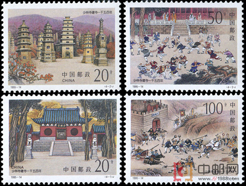少林寺,位于河南省登封县城西25里中岳嵩山西麓少室山阴五乳峰下。少林寺以建在少室丛林而得名,又称“少林禅寺”或“大少林寺”,该寺始建于北魏太和十九年,是孝文帝元宏为安顿印度沙门跋陀在此落迹传教而敕建。建国后,从1979年起,拨专款进行整修,使其以古老的历史、威武神奇的少林武术和秀丽的风光,名扬天下。为纪念少林寺建寺1500年,作为河南省的地方选题,邮电部发行了这套纪念邮票。