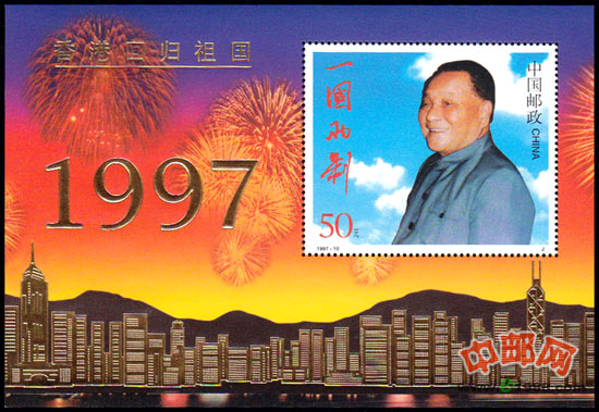 为纪念这一举世瞩目的重大事件,邮电部发行了这套《香港回归祖国》纪念邮票,2枚邮票画面都以解决香港问题的历史性文献为中心,下部饰以环绕的花环。而小型张则以邓小平的形象作为主图。