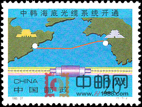 【图案面值】 J (1-1)中韩海底电缆系统开通 20分 5104.5 万枚邮票介绍: 中韩海底光缆是连接中韩两国的第一条海底光缆系统,对中国来说也是继1993年12月光缆系统开通之后的第二条海底光缆。它的建成不仅将极大提高中韩两国之间的通信能力,而且也将提高其它地区经由中韩两国经转的通信能力,这一系统将成为国际通信网的重要组成部分。