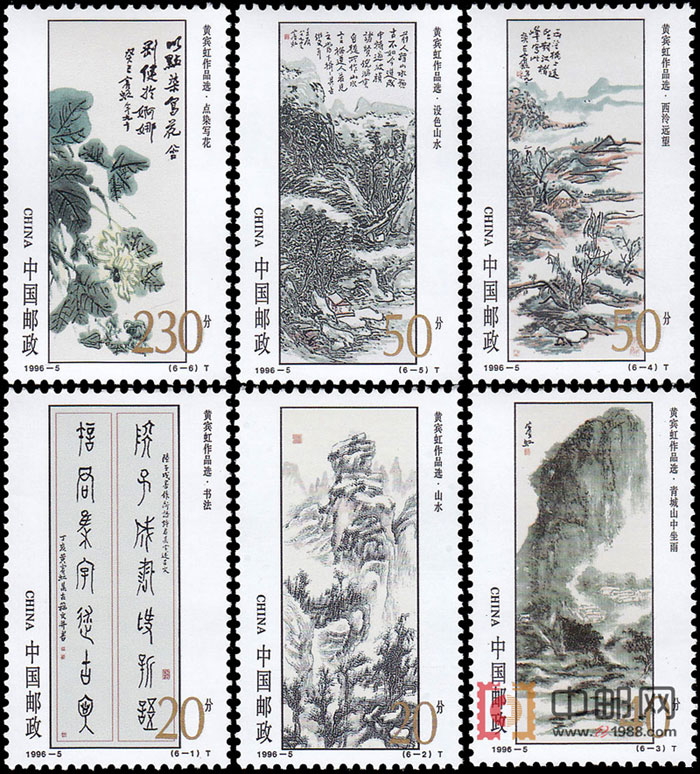 黄宾虹,名质,字朴存,乃于中年更字宾虹命名,并以此名世。黄宾虹特擅山水兼工人物花鸟草虫。他博采众长,我师我法,屡经变革,来去自然,使作品渐脱古人约束,形成自己独特之风貌。“一生九十笔愈老,千军为扫万马倒”。为纪念这位伟大的人民画家,邮电部发行了这套特种邮票。所选作品,均是画家的代表作,表现了他那深厚的创造力和大气磅礴的艺术气质。
