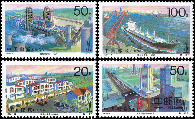 1976年7月28日凌晨3时42分53秒,唐山市遭到7.8级强烈地震的袭击,地震造成的经济损失达300亿元,灾情之重,损失之巨,举世罕见。震后20年来,在党的十一届三中全会方针指引下,唐山正如劫后之凤凰,奋翅于冀东之沃野,不仅医治了地震之创伤,而且跟上时代猛进之步伍,尤其1988年至1995年间,经济发展迅速。为纪念唐山抗震20周年,邮电部发行了这套邮票,设计者以写实手法,通过农舍、工厂、街景和海港等侧面,揭示了这一主题。