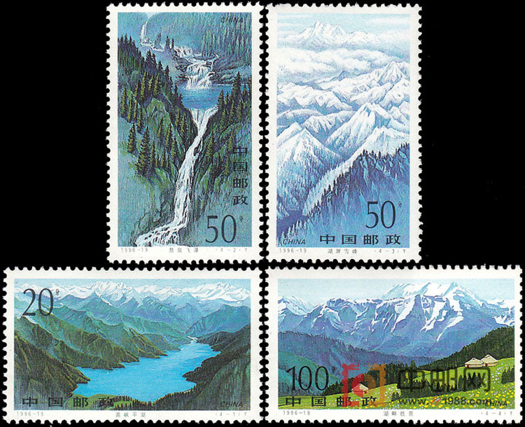 天池在新疆昌吉回族自治州阜康县境内,处于天山东段最高峰-----博格达峰的山腰,海拔1928米,距鸟鲁木齐约110公里。天池面积约5平方公里,狭长形,长约30 00米,最宽处约1000米,湖水最深处约100米,系高山溶雪汇集而成,湖水清澈,绿如碧玉。四周雪峰环抱,山腰上有大片云杉林,形如宝塔,直刺云天,是著名的风景树木。深绿的云杉林,挺拔、整齐、很有气势,显示出一种高山风景区特有的景色。清澈的湖水,皑皑的雪峰和葱茏挺拔的云杉林,构成了天山天池的迷人景色。天山天池早在1982年就被列为第一批国家重点保护的风景名胜区。是著名的避署胜地。全套共4枚。