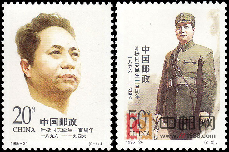 叶挺(1896----1946)广东惠阳人。中国无产阶级革命家,解放军创建人之一。北伐战争时期任国民革命军第四军独立团团长,该团在湖北的汀泗桥和贺胜桥等著名战役中,击溃军阀吴佩孚主力,被誉为“铁军”。1927年,他参加领导了南昌起义和广州起义。抗日战争时期,任新四军军长。1941年在国民党发动的“皖南事变” 中负伤被俘。1946年3月,在中共中央坚决要求下,叶挺同志被释放,同年4月8日,在由重庆返延安途中因飞机失事遇难。全套共2枚。