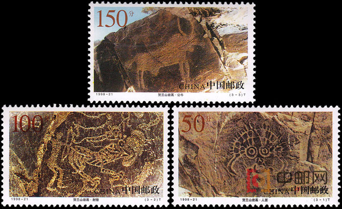 贺兰山岩画,发现于60年代末期。岩画凭借石质工具是无法完成的,其绘制应在金属工具出现之后。经考察,贺兰山岩画大部分是春秋战国以来北方游牧民族所创作。贺兰山岩画从内容、制作方式上可分为南、中、北三个部分。邮票设计者即以此为标准,确定了这套邮票3幅图案的基本内容。中部岩画以人面像、类人首的丰富多变而闻名;南部岩画以战争、狩猎为主题;北部演化则以动物形象取胜。《贺兰山岩画》邮票正是抓住了每一部分岩画的典型代表为素材,概括了贺兰山岩画的基本成就。