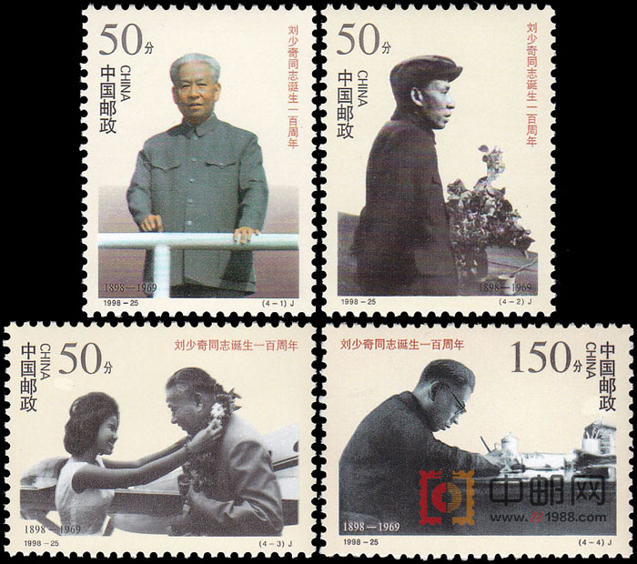 这套纪念邮票是以4张照片为原图,忠实而典型地反映了刘少奇在不同时期兢兢业业的伟大的高大形象。图1为1965年10月1日,毛泽东、刘少奇陪同柬埔寨王国西哈努克亲王登上天安门城楼,参加一年一度的国庆大典。图2为1945年5月,刘少奇在中共七大会议上,作《关于修改党章的报告》报告时的情景。图3为当选为中华人民共和国主席后,刘少奇于1965年访问柬埔寨时,受到王国政府和人民盛大欢迎时的情景。图4为刘少奇同志的夫人王光美为他拍的一幅工作照。