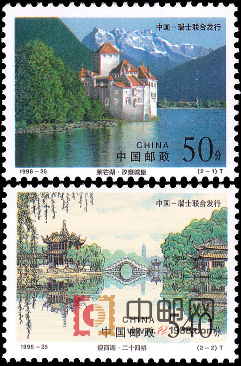 为加强中国和瑞士两国人民的友谊,促进两国的邮政合作,联合发行特种邮票一套2枚。图1为莱芒湖,又称日内瓦湖。位于瑞士西南与法国交界处,罗纳河自东流入莱芒湖,由西而去。莱芒湖是阿尔卑斯山地的最大湖泊,世界著名的冰蚀湖之一。图2为瘦西湖,原名炮山河,一名保障河,又称长春河,位于江苏扬州市西郊,六朝以来即为风景胜地,。邮票画面上的二十四桥,位于瘦西湖内。
