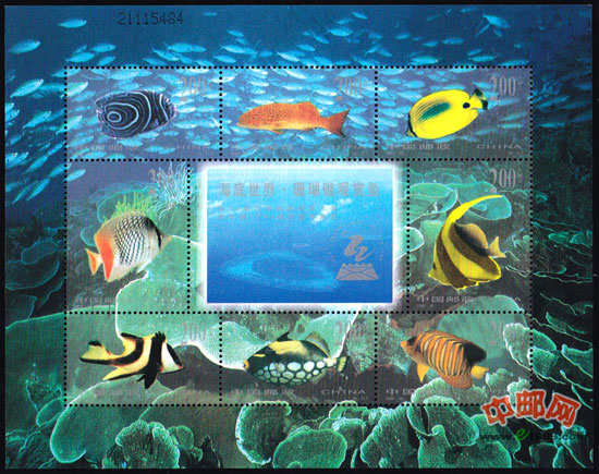 这套《海底世界·珊瑚礁观赏鱼》特种邮票,是我国为迎接第22届万国邮联大会和’99世界邮展在北京举办而发行的第2套小版张邮票。小版张的中心部位图案是我国南海中的西沙群岛。邮票背景上即为海水中的蔷薇珊瑚,它属于珊瑚虫纲,是一种低级动物。