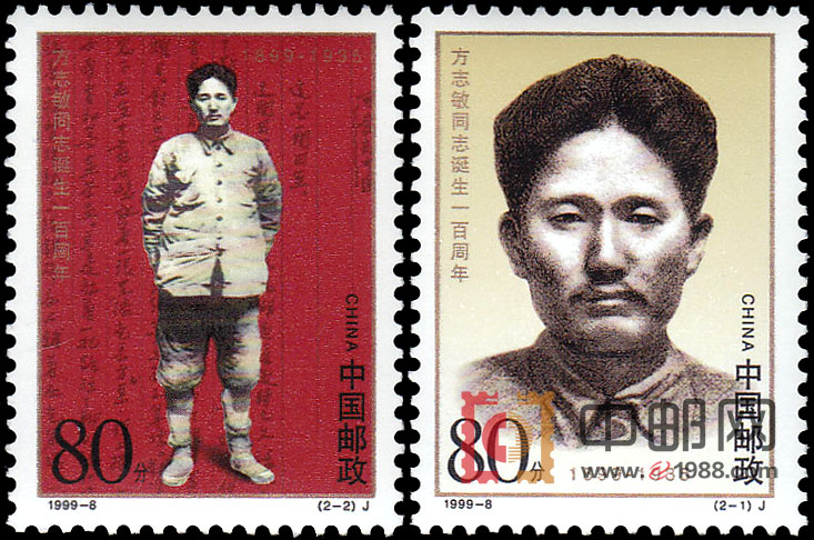 图案面值:J(2--1) 方志敏像 80分 3320.8万枚J(2--2) 坚贞不屈 80分 2373.3 万枚邮票介绍: 方志敏(1899—1935),无产阶级革命家、人民军队早期将领。他领导过农民武装暴动,建立了赣东北革命根据地。红军长征时期,他率军北上,与敌人顽强作战,不幸被俘,英勇就义。在狱中他写下了《可爱的中国》、《狱中记实》等作品。这套邮票根据历史照片设计而成,真实地再现了方志敏不屈的共产党员形象。