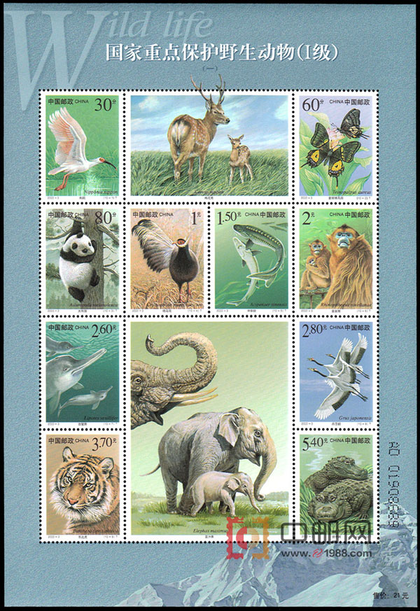 国是世界上拥有野生动物最多的国家之一。有许多珍稀特有的物种。为拯救濒危野生动物,我国于1959年开始公布国家保护野生动物,于1989年颁布了《中华人民共和国野生动物保护法》。这套邮票是国家重点保护野生动物(1级)系列邮票中的第一套,包括了鸟、兽、爬行、鱼、昆虫等五大类12种动物(包括两枚邮票),邮票生动细致地描绘了这些动物的优美体态和不同生境。