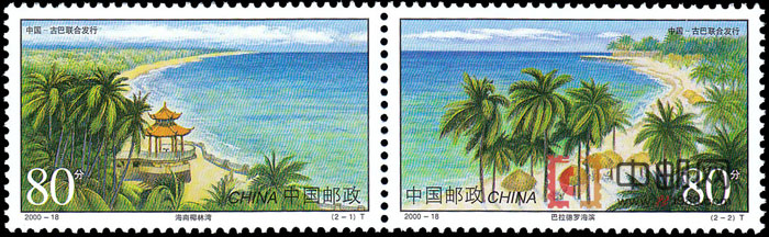 海南椰林湾和巴拉德罗海滨分别为中国和古巴的海滨旅游胜地。海南椰林湾位于海南省东北部文昌市境内,这里椰林如海,风景如画,有优美的海湾、洁净的沙滩、清澈湛蓝的海水,被誉为“椰子的王国”、“黄金的海岸”。巴拉德罗海湾是享誉世界的游览胜地,这里蓝天白云,阳光充沛,有平缓绵延达20多公里的海滩,海水清澈湛蓝,沙滩洁白如雪,被誉为“人间伊甸园”。这套邮票由中国与古巴两国邮政联合发行。