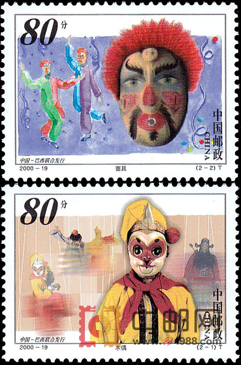 木偶和面具分别为中国和巴西传统的民间艺术。福建泉州地区的提线木偶,色彩鲜艳,造型独特,操作灵活自如,表演栩栩如生。邮票上的孙悟空形象源于中国古典文学名著《西游记》。在巴西民间,每年都要举行持续数日的盛大狂欢节。人们穿上戏服或头戴面具,装扮成神话或古代人物,在街头载歌载舞。狂欢节面具丰富多彩,或幽默夸张,或严肃正统,有很强的艺术感染力。这套邮票由中国与巴西两国邮政联合发行。