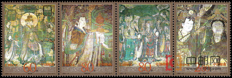 永乐宫是我国首批公布的重点文物保护单位,1988年被列入《世界遗产名录》预备清单。永乐宫位于山西省芮城县城北的古魏国遗址内,北枕中条山岭,南临黄河古道,规模宏大。《永乐宫壁画》邮票图案皆选自《朝元图》,“西王母”的图案选自于该殿西壁中部;“奉宝云女”的图案选自于选自该殿西壁中部;“东极救苦天尊”的图案选自于该殿西壁外侧;“金星、水星”的图案选自于该殿北壁东段。