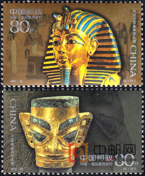 三星堆金面罩头像和图坦卡蒙金面头像,分别为中国和埃及有三千多年历史的珍贵文物。三星堆金面罩头像出自四川广汉三星堆遗址,是先民以王的礼仪祭祀天地山川神灵所用的精美鎏金青铜饰物。图坦卡蒙金面罩是瑰宝镶嵌的精美的黄金面具,出自埃及卢克索底比斯王陵谷第十八王朝法老图坦卡蒙的陵墓。两件文物工艺精湛,气度非凡,展现了两个世界文明古国往日辉煌的文化艺术成就。这套邮票是由中国和埃及两国邮政联合发行的。