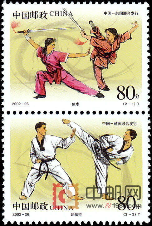 中国邮政和韩国邮政于2002年11月20日联合发行一套以“武术与跆拳道”为主题的特种邮票,中韩双方使用同一设计图案。
