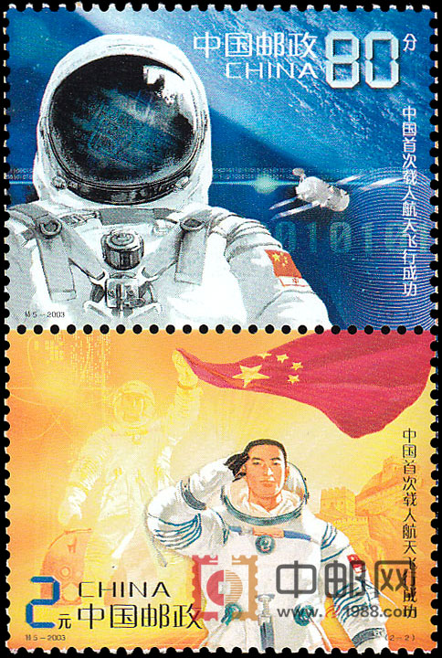 中国从1992年开始研制载人飞船,1999年11月20日成功发射了“神舟”一号宇宙飞船,此后至2001年1月的两年时间里,又先后进行了3次无人飞船发射试验。现在,历时12年的载人飞船翱翔太空获得圆满成功,成为世界上第三个以自主技术发射宇宙载人航天器的国家。为纪念我国首次载人航天飞行成功,中国邮政与中国香港邮政、中国澳门邮政同时特别发行纪念邮票,将中国航天的历史性壮举载入方寸。中国邮政发行的两枚邮票主要突出宇航员的身影,凸显载人飞船的目标实现,背景是“神舟”五号载人飞船翱翔太空的靓影和深邃浩淼的太空以及象征中国的长城和飘扬的五星红旗,后者的暖色调洋溢着喜庆色彩,十分耀眼。同第一枚的深蓝色太空背景形成了强烈的对比,让人们感受到中国人征服宇宙的脚步声。