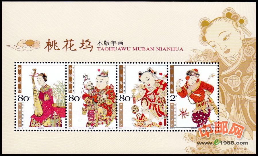 国家邮政局定于2004年1月14日发行《桃花坞木版年画》特种邮票1套4枚,小全张1枚。
