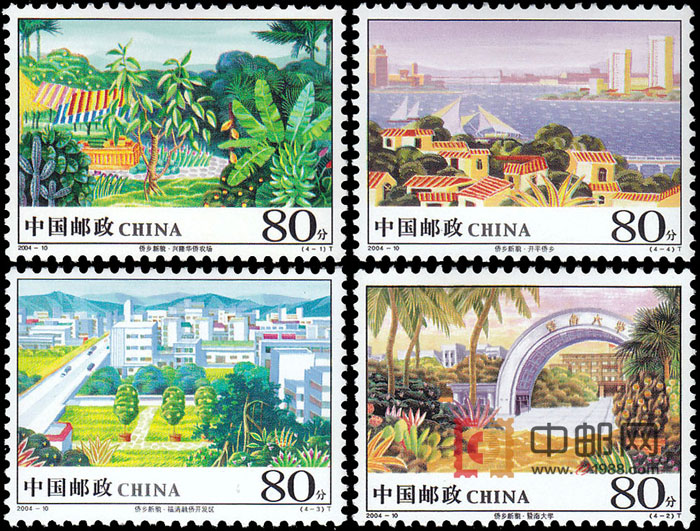 4枚邮票的主图分别是兴隆华侨农场、暨南大学、福清融侨开发区和开平侨乡。兴隆华侨农场位于海南东南部万宁市西南,创建于1951年9月。优越的地理环境、旖旎的热带风光和浓郁的侨乡风情,使兴隆发展成为农、工、贸、旅游综合发展的国有华侨企业。暨南大学是一所多学科的综合大学,也是中国第一所由国家创办的华侨学府,校址在广东广州市黄埔大道西。学校设有经济、管理、理工、信息科学技术等院系和多个研究机构。福清融侨经济技术开发区在福建福清市,创建于1987年,1992年经国务院批准成为国家级开发区。融侨开发区的经济一直在稳步、健康地发展。开平侨乡毗邻港澳,地处珠江三角洲西南部,是全国著名侨乡。全市现有“三来一补”、“三资”企业636家,侨属企业1700多家,其中有产品出口企业50多家,出口品种360多个。