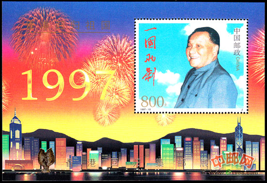 经邮电部批准发行,在1997-10 香港回归祖国 小型张上加印金色“香港回归集邮展”字样。