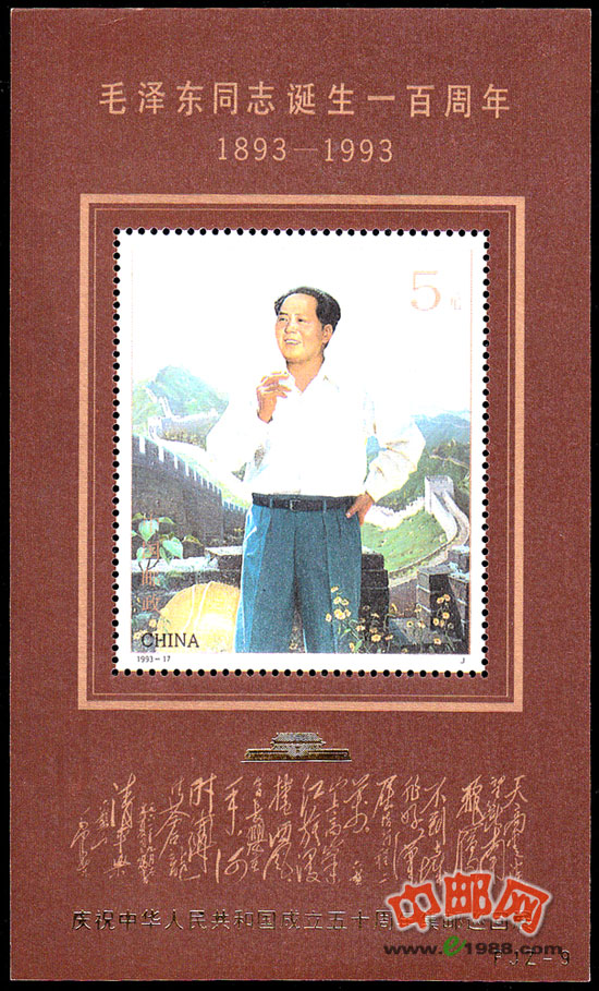 经邮电部批准发行,在1993-17 毛泽东同志诞生一百周年 小型张上加印金色“庆祝中华人民共和国成立五十周年集邮巡回展“”字样。