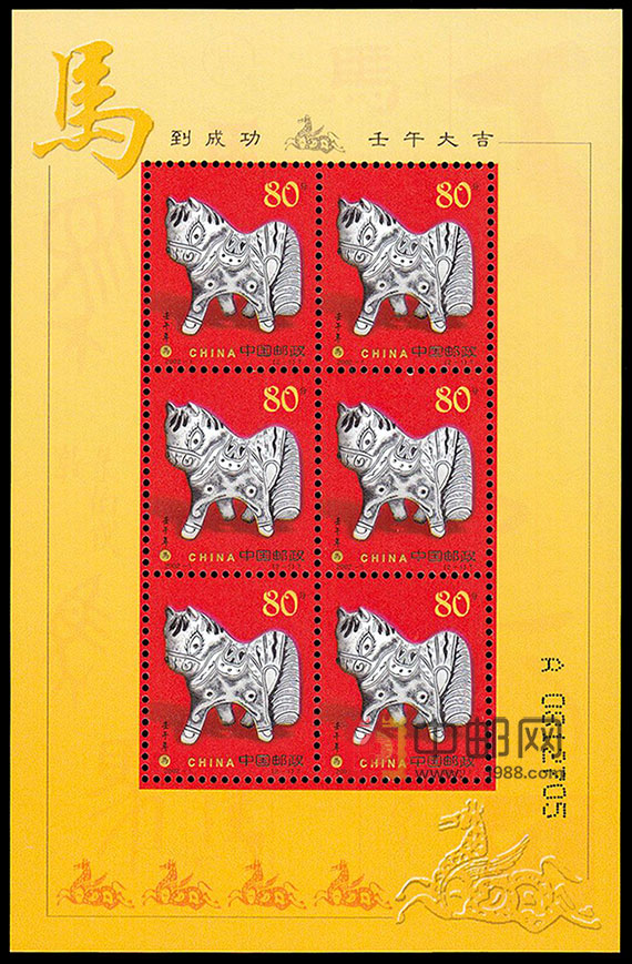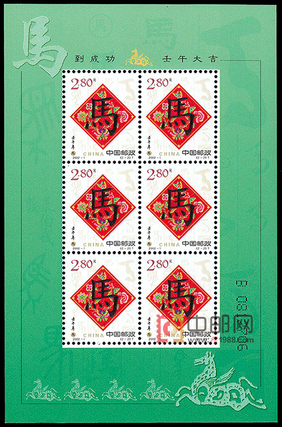 2002年是农历壬午年,即十二生肖纪年的马年。马与人类有着特别密切的关系,据考,马的驯化始于父系氏族时期,是社会生产力发展的标志之一。中国人对马尤为钟爱,不仅把马作为优越的生产、交通工具,而且被作为精神、情感和才能的象征,进而升华为博大深厚的马文化,渗透到文字、美术、音乐等各个领域。至今人们还用“马到成功”来对人类表达事业上的美好祝愿及成功的赞誉,用“龙马精神”来赞美人的精神旺盛与雄伟。