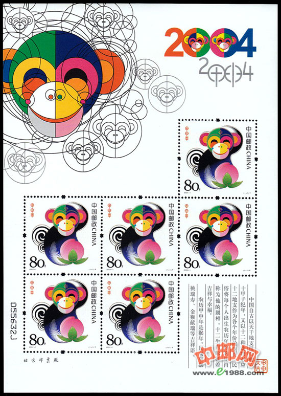 2004年农历甲申年,即猴年。这是第三轮生肖票的第一套。猴为常见的攀援动物,在中国传统文化中意蕴浓厚,吉祥和象征。方形的票面上,“猴三世”正笑眯眯地冲着我们乐,左手挠头,右手抱桃,憨态可掬,灵气毕现。简洁的画笔、夸张艳丽的色彩使之与第二轮生肖票产生了明显的“代沟”。整套邮票的亮点在鲜艳的猴头肖像和蟠桃上,不同的色块将猴脸分为左右两半,错落搭配和谐到位,白色的邮票底图上主要是红、黄、黑、绿等鲜明的色块,视觉层次分明,简约又好看。祝愿人们在新的一年:时尚洋溢、和谐美满、四季平安、健康长寿。国家邮政局专门印制了含4枚生肖邮票的小版张,赠送给新邮预订户。另发行小版张和小本票。