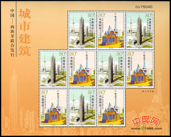 中国与西班牙联合发行的邮票。分别表现了中国上海的金茂大厦和西班牙的古埃尔公园。金茂大厦位于上海浦东新区陆家嘴金融贸易区,是一座88层的超高层大厦,建筑高度