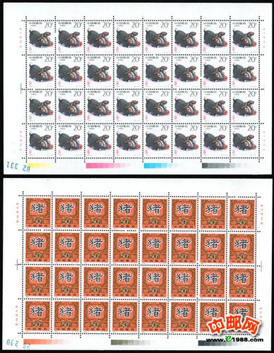 这是新一轮主肖邮票的第四套。以一只稚拙习爱的小黑猪和农家窗纸上的“猪”字为邮票图案。肥猪拱门的图案为民间布玩具。通过视角选择将小猪拱肩、探首、耸鼻、翘嘴等关键拱门姿态刻划的栩栩如生,呼之欲出。喜迎新春的图案是勾以白边的黑色隶书“猪”字的窗纸,窗格呈桔红色洋溢着欢快,祥和。“双猪图”的窗花寓意着畜业兴旺。